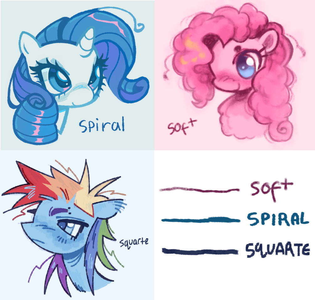 2. spiral. a textured dense brush that becomes softer around the edges with more pressure. good for colouring and lining